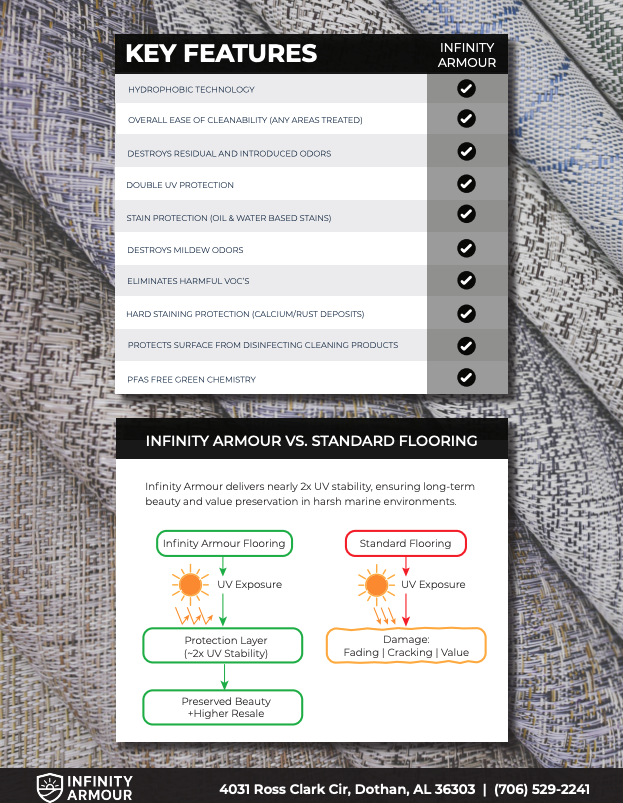 INFINITY ARMOUR: Next-Level UV Protection Infinity innovation at work again! Introducing Infinity Armour—the breakthrough solution to critical UV performance concerns. Engineered to shield your flooring from harmful ultraviolet rays in the harshest marine environments, Infinity Armour ensures lasting protection where it matters most. Backed by over two years of rigorous development and testing, Infinity Armour delivers nearly double the UV stability, setting a new benchmark for marine flooring performance. This advancement firmly positions Infinity as the most desirable flooring product on the market. With Infinity’s innovative products, you gain peace of mind through continuous protection— preserving your boat’s beauty and value season after season.